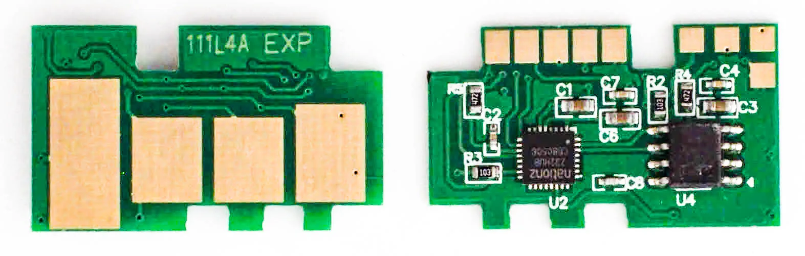 Чіп - це не велика за розміром мікросхема, в яку вшита інформація про ресурс самого картриджа, забезпечений функцією обміну даними з принтером. Простіше кажучи, завдяки чіпу апарат може порахувати кількість надрукованих сторінок. У момент, коли лічильник сторінок підійшов до кінця, ви побачите попередження про те, що картридж закінчився і його необхідно замінити, навіть якщо в бункері картриджа залишився невикористаний тонер.