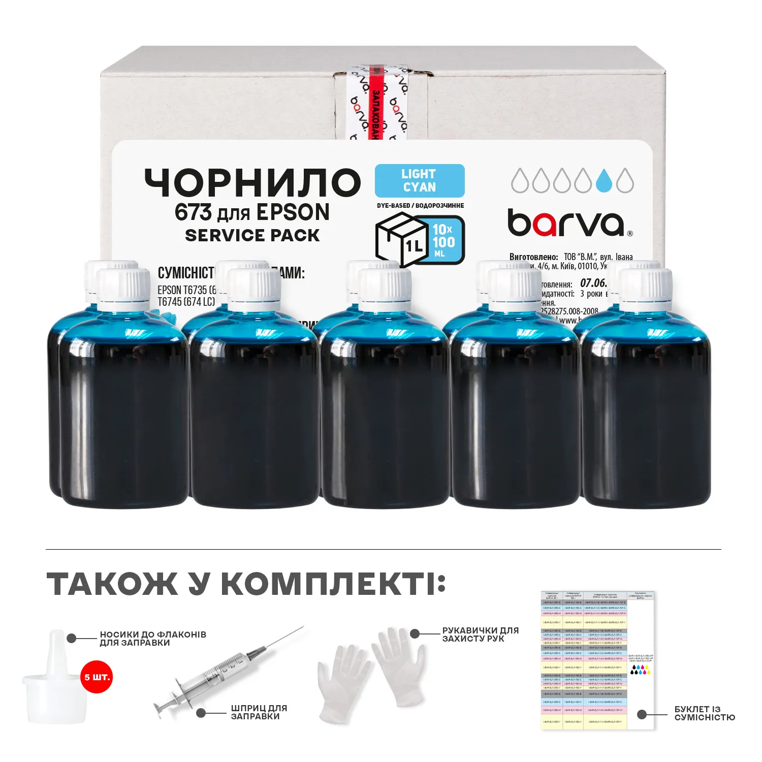 Чорнило сумісне для Epson 673 LC спеціальне 10x100 мл, водорозчинне, світло-блакитне Service Pack Barva (E-L800LC-1SP) опис: