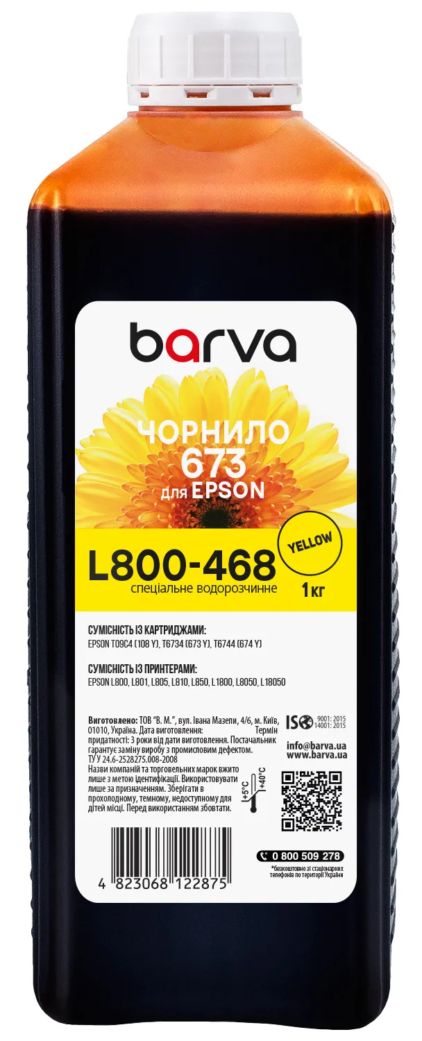 Чорнило сумісне для Epson 673 Y спеціальне 1 кг, водорозчинне, жовте Barva (L800-468) опис: