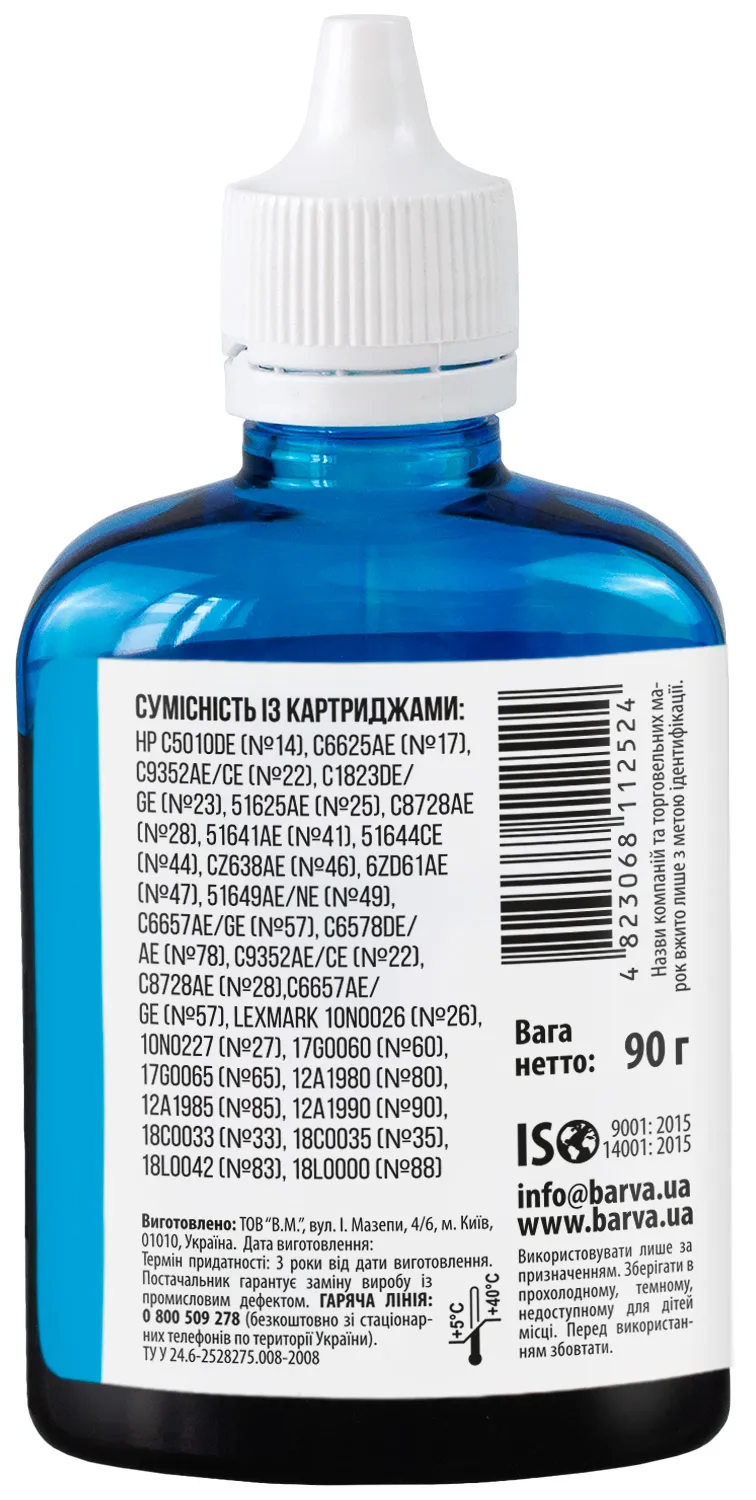Українська компанія ТОВ «В.М.» займається виробництвом чорнил під торговою маркою Barva вже багато років. На базі власної лабораторії відбувається як розробка нових формул, так і неперервний контроль якості продукції, що випускається. При виробництві чорнил виробник слідує стандартам ISO 9001:2015 та ISO 14001:2015.