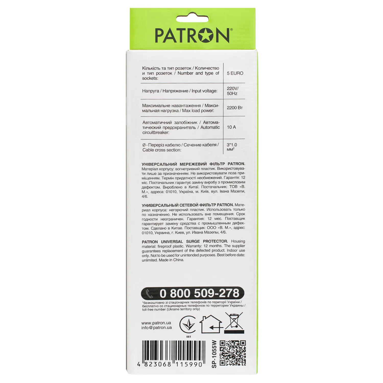 Фільтр мережевий 5 розеток, 1,8 м, білий, 3*1мм2 Patron (SP-1052W)
