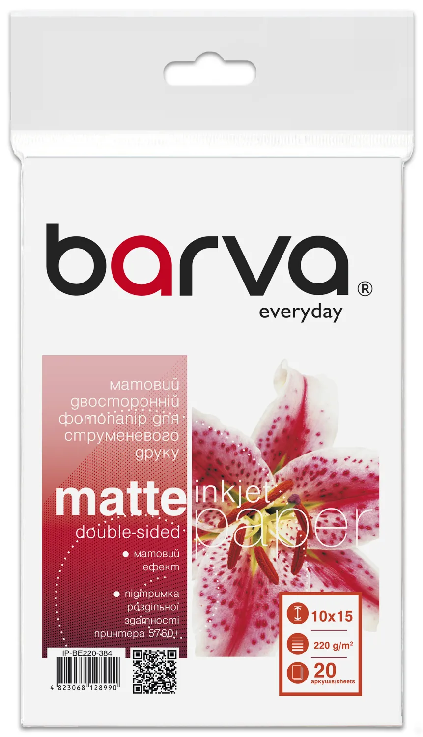 Фотопапір матовий двосторонній 220 г/м2, 10x15 см, 20 арк Everyday Barva (IP-BE220-384) опис
