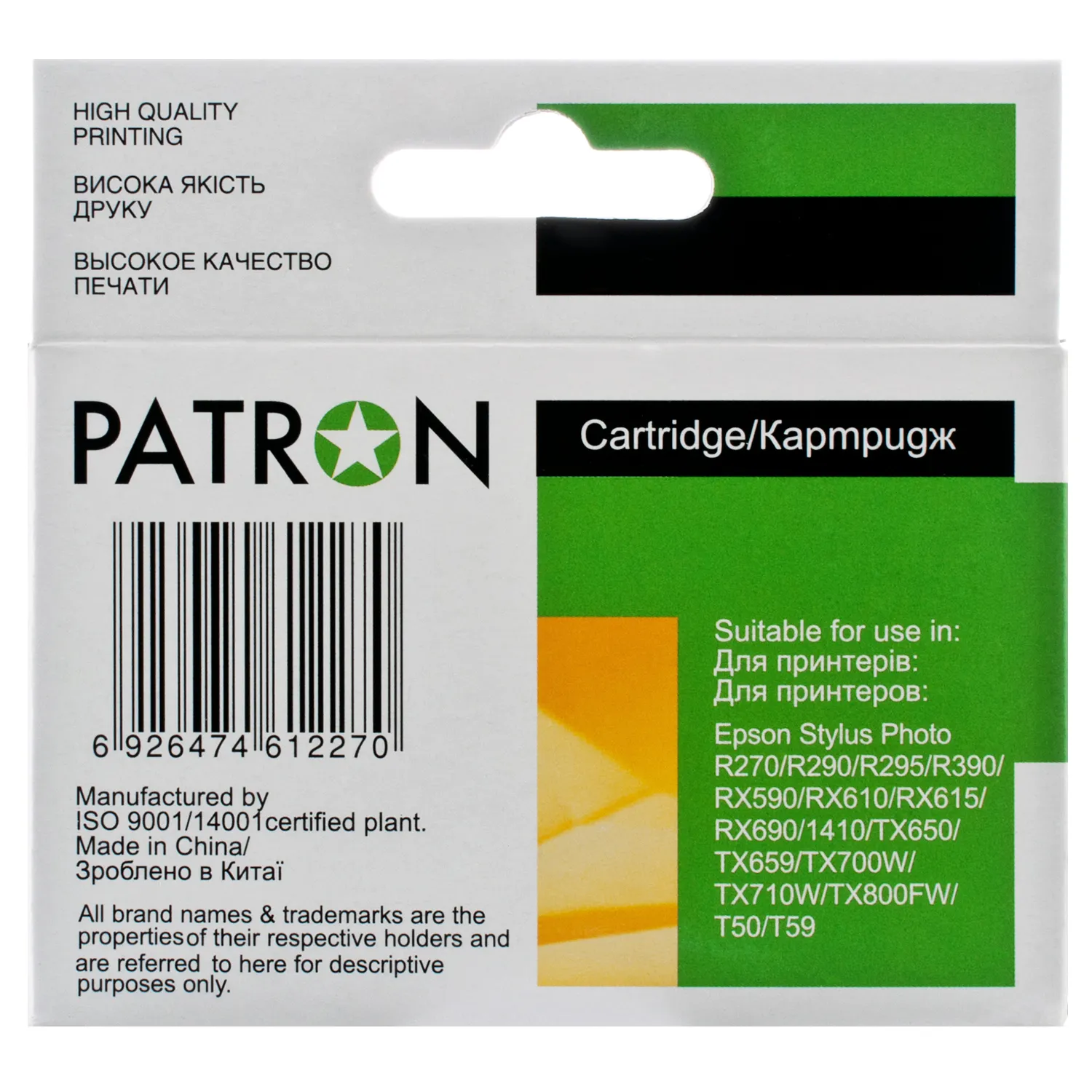 Струменеві картриджі(cartridge) Patron вже завоювали популярність серед користувачів і є прекрасною альтернативою оригінальним витратним матеріалам. Вся продукція проходить перевірку у власній лабораторії ТОВ «В.М.», завдяки чому Ви можете бути впевненими в якості продукції.