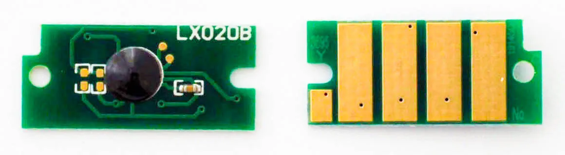 Что такое чип для картриджа? Это небольшая по размеру микросхема, в которую вшита информация о ресурсе самого картриджа, обеспечен функцией обмена данными с принтером. Проще говоря, благодаря чипу аппарат может посчитать количество отпечатанных страниц. В момент, когда счётчик страниц подошел к концу, вы увидите предупреждение о том, что картридж закончился и его необходимо заменить, даже если в бункере картриджа остался неиспользованный тонер.