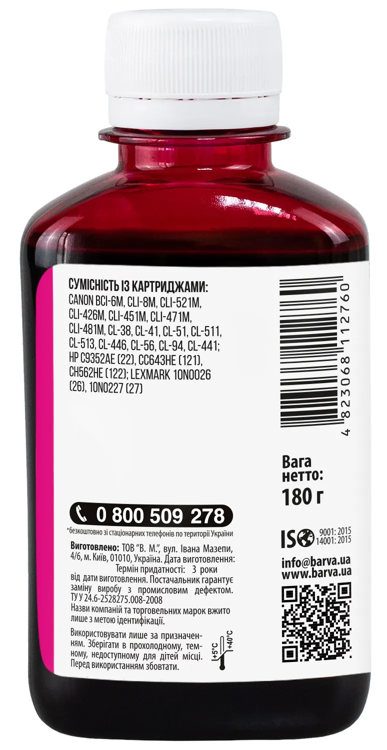 Украинская компания ООО «В.М.» занимается производством чернил под торговой маркой Barva уже много лет. На базе собственной лаборатории осуществляется как разработка новых формул, так и непрерывный контроль качества выпускаемой продукции. При производстве чернил производитель следует стандартам ISO 9001:2015 и ISO 14001:2015.