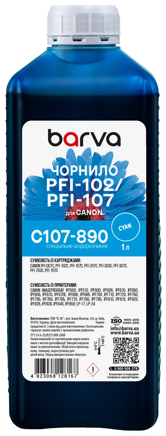 Чернила для Canon PFI-102/PFI-107 C специальные 1 л, водорастворимые, голубые Barva (C107-890) - заказывайте на сайте patronservice.ua