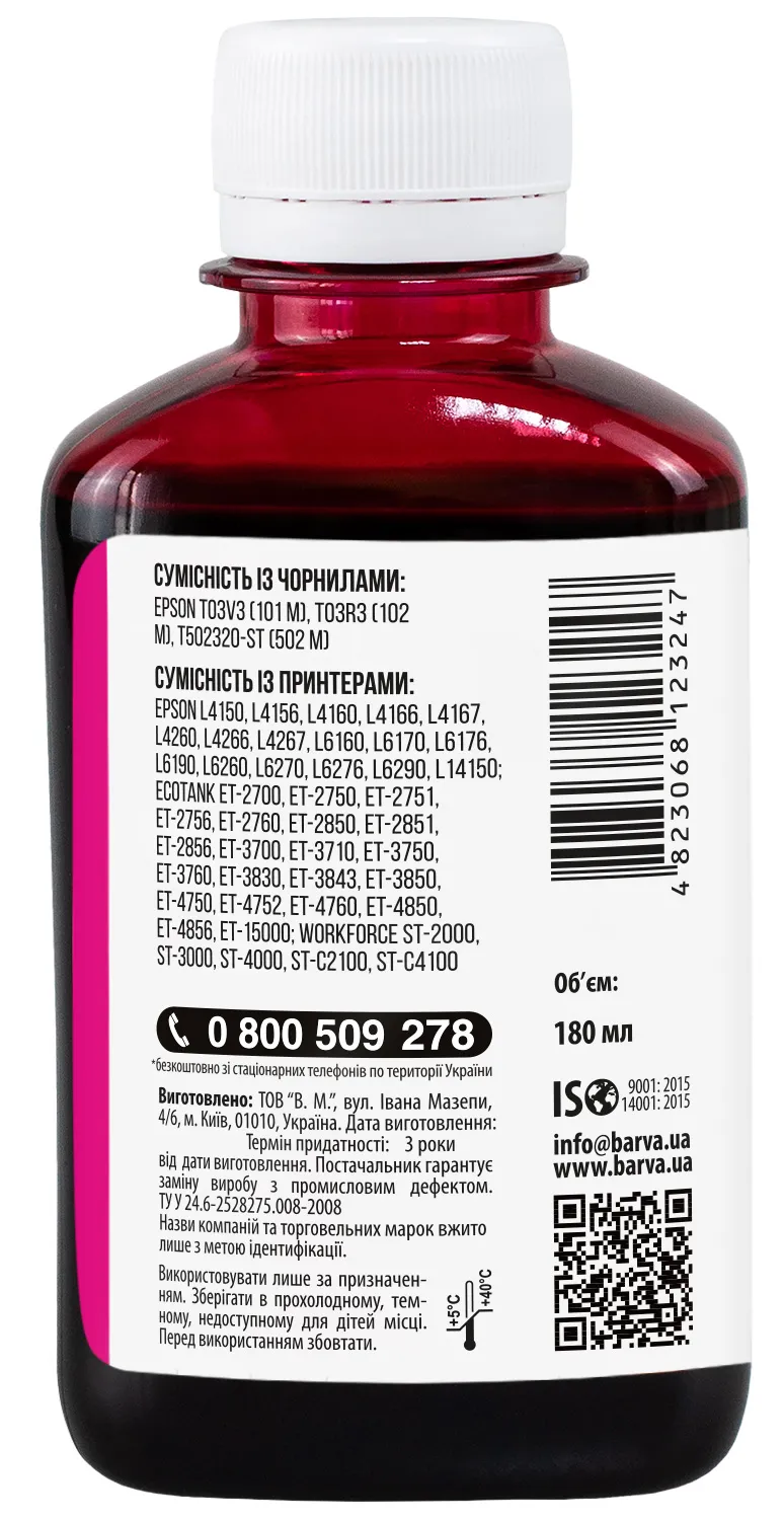 Украинская компания ООО «В.М.» занимается производством чернил под торговой маркой Barva уже много лет. На базе собственной лаборатории осуществляется как разработка новых формул, так и непрерывный контроль качества выпускаемой продукции. При производстве чернил производитель следует стандартам ISO 9001:2015 и ISO 14001:2015.