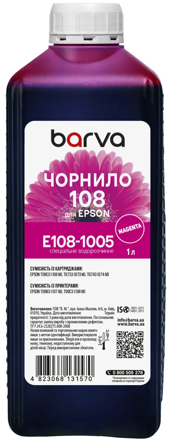 Вы можете купить Чернила для Epson 108 M специальные 1 л, водорастворимые, пурпурные Barva (E108-1005) в нашем интернет-магазине с доставкой по Киеву и всей Украине.