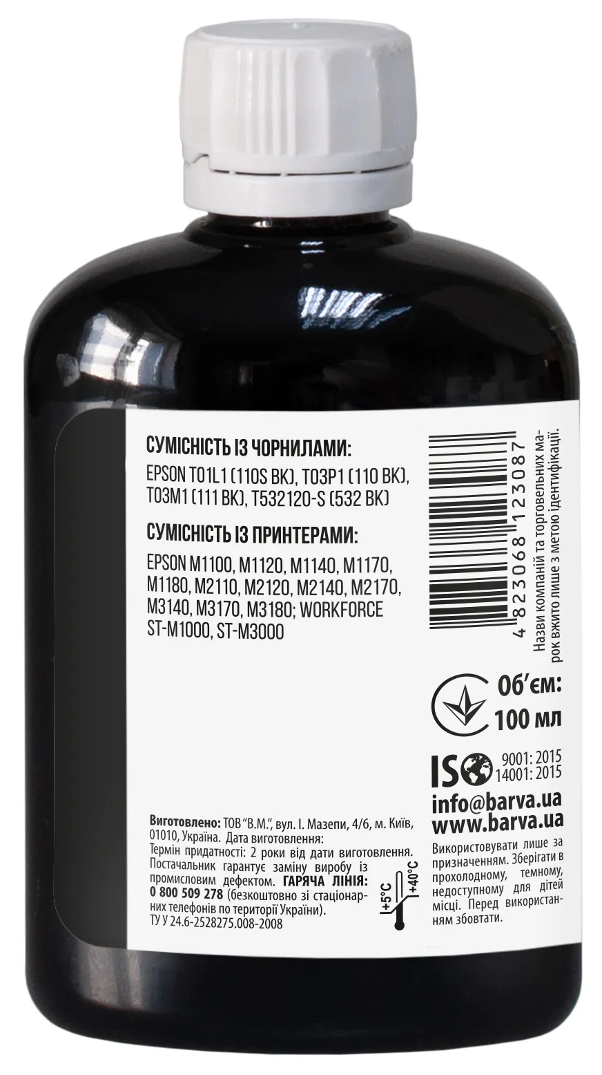 Украинская компания ООО «В.М.» занимается производством чернил под торговой маркой Barva уже много лет. На базе собственной лаборатории осуществляется как разработка новых формул, так и непрерывный контроль качества выпускаемой продукции. При производстве чернил производитель следует стандартам ISO 9001:2015 и ISO 14001:2015.