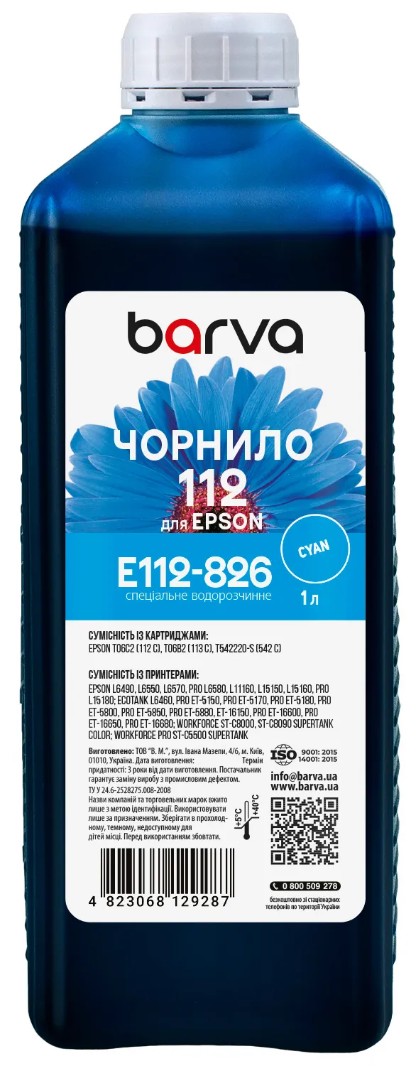 Чернила для Epson 112 C специальные 1 л, водорастворимые, голубые Barva (E112-826) - лучшие товары для вашего принтера