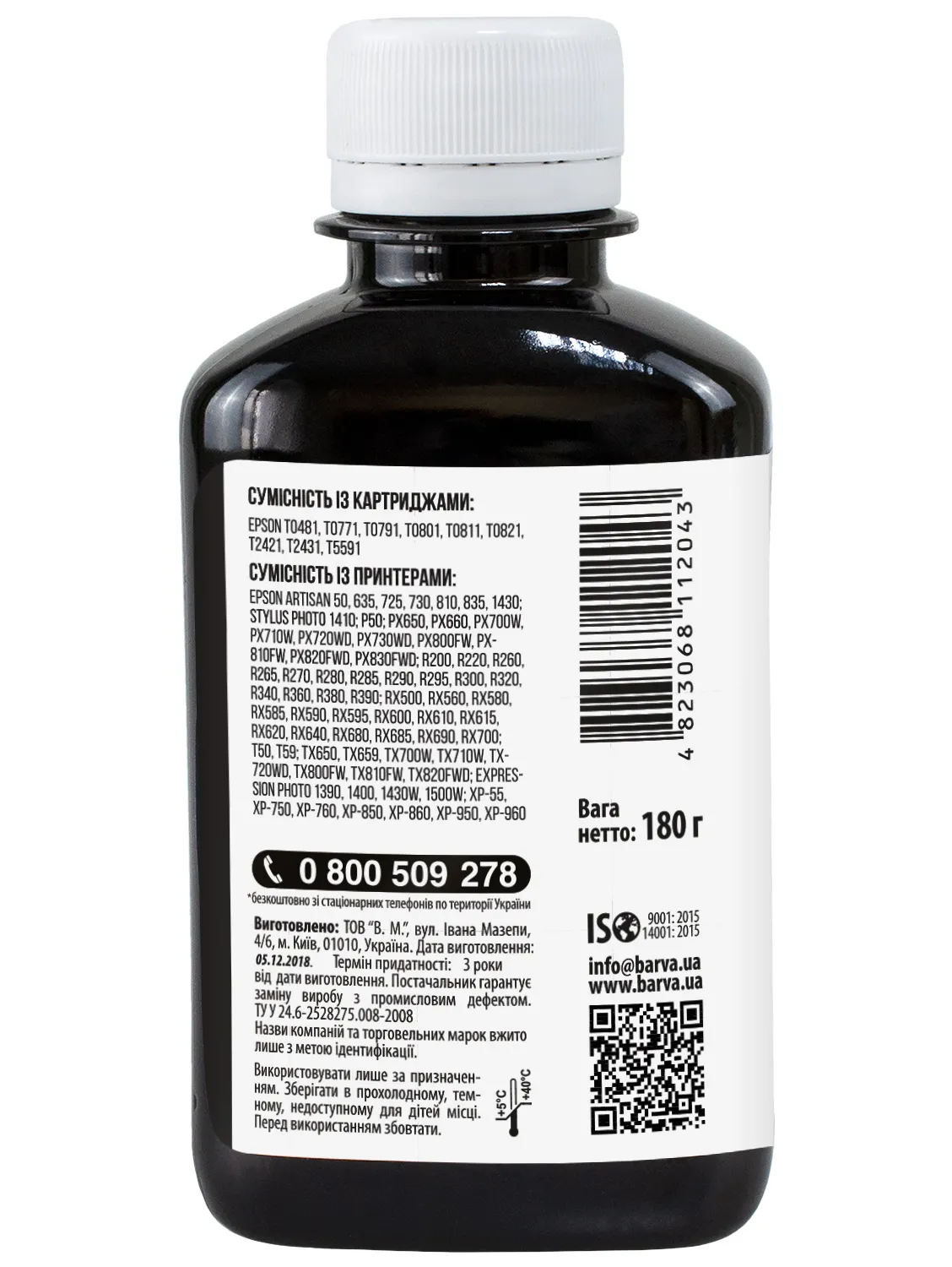 Украинская компания ООО «В.М.» занимается производством чернил под торговой маркой Barva уже много лет. На базе собственной лаборатории осуществляется как разработка новых формул, так и непрерывный контроль качества выпускаемой продукции. При производстве чернил производитель следует стандартам ISO 9001:2015 и ISO 14001:2015.