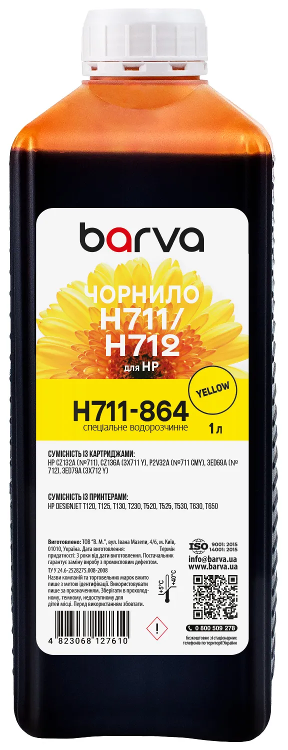 Чернила для HP 711/712 Y специальные 1 л, водорастворимые, желтые Barva (H711-864) - прекрасный выбор для вас