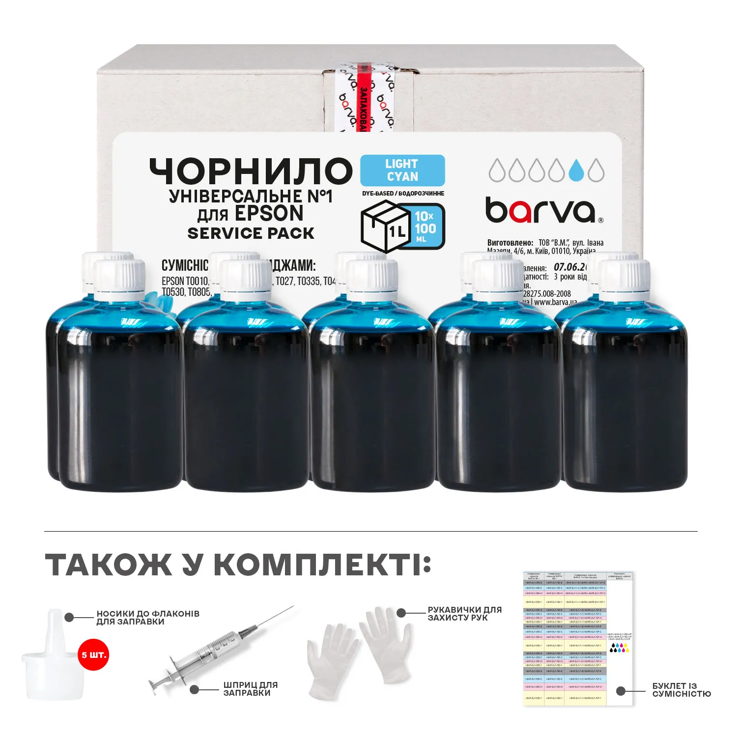 Чернила совместимые для Epson универсальные №1 10x100 мл, водорастворимые, светло-голубые Service Pack Barva (EU1-1SP-LC) - заказывайте на сайте patronservice.ua