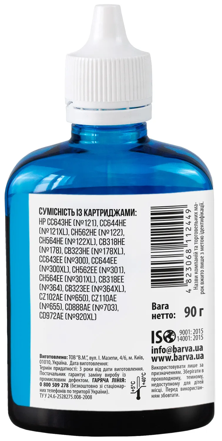 Украинская компания ООО «В.М.» занимается производством чернил под торговой маркой Barva уже много лет. На базе собственной лаборатории осуществляется как разработка новых формул, так и непрерывный контроль качества выпускаемой продукции. При производстве чернил производитель следует стандартам ISO 9001:2015 и ISO 14001:2015.