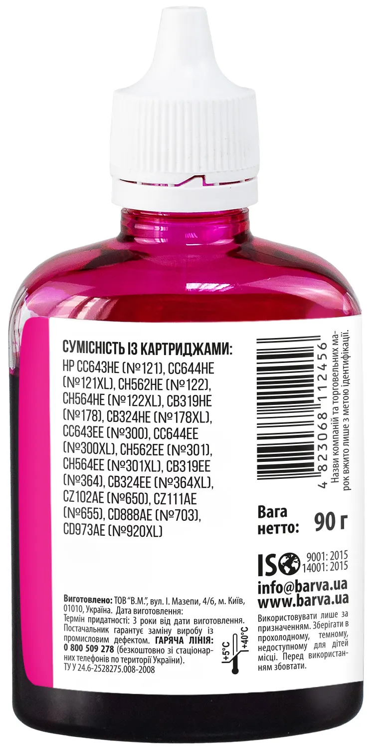 Украинская компания ООО «В.М.» занимается производством чернил под торговой маркой Barva уже много лет. На базе собственной лаборатории осуществляется как разработка новых формул, так и непрерывный контроль качества выпускаемой продукции. При производстве чернил производитель следует стандартам ISO 9001:2015 и ISO 14001:2015.