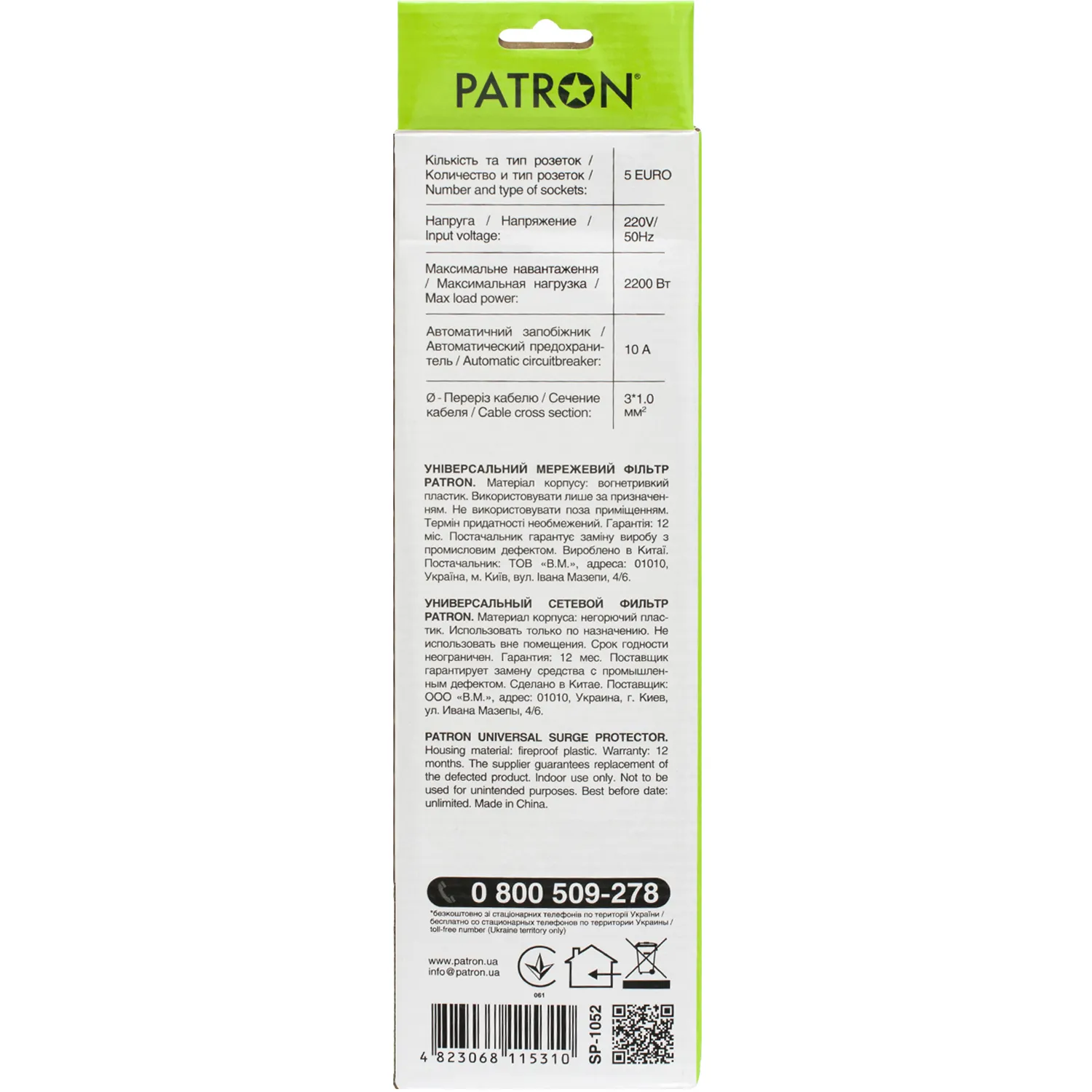 - Фильтр сетевой 5 розеток, 1,8 м , черный, 3*1мм2 Patron (SP-1052)