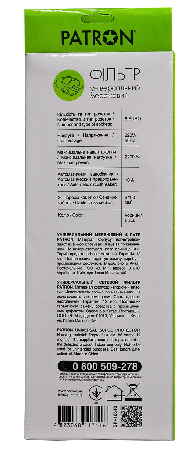 Корпус фильтра Patron выполнен из прочного негорючего пластика и имеет отверстия для крепления на стену. Кабель сетевого фильтра имеет сечение 3*1.0 мм, что позволяет стабильно работать при высоких нагрузках и не перегреваться.