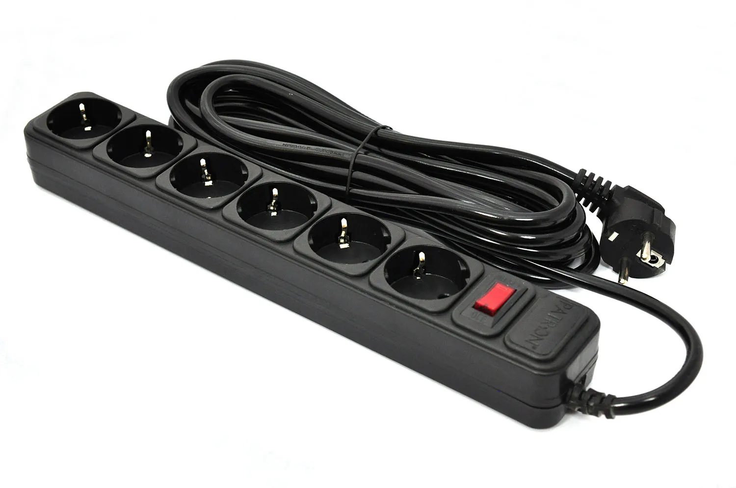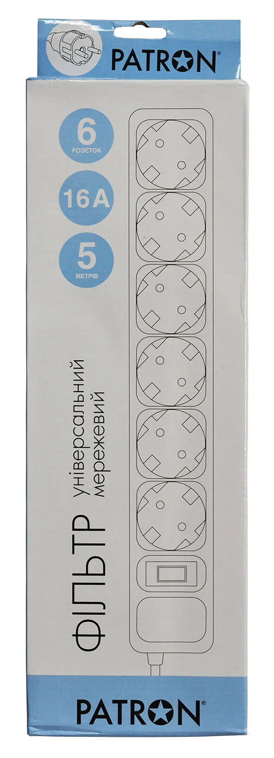 - Фильтр сетевой 6 розеток, 5 м, черный, 3*1,5 мм2 Patron (SP-1665)