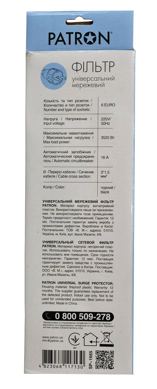 Корпус фильтра Patron выполнен из прочного негорючего пластика и имеет отверстия для крепления на стену. Кабель сетевого фильтра имеет сечение 3*1.5 мм, что позволяет стабильно работать при высоких нагрузках и не перегреваться.