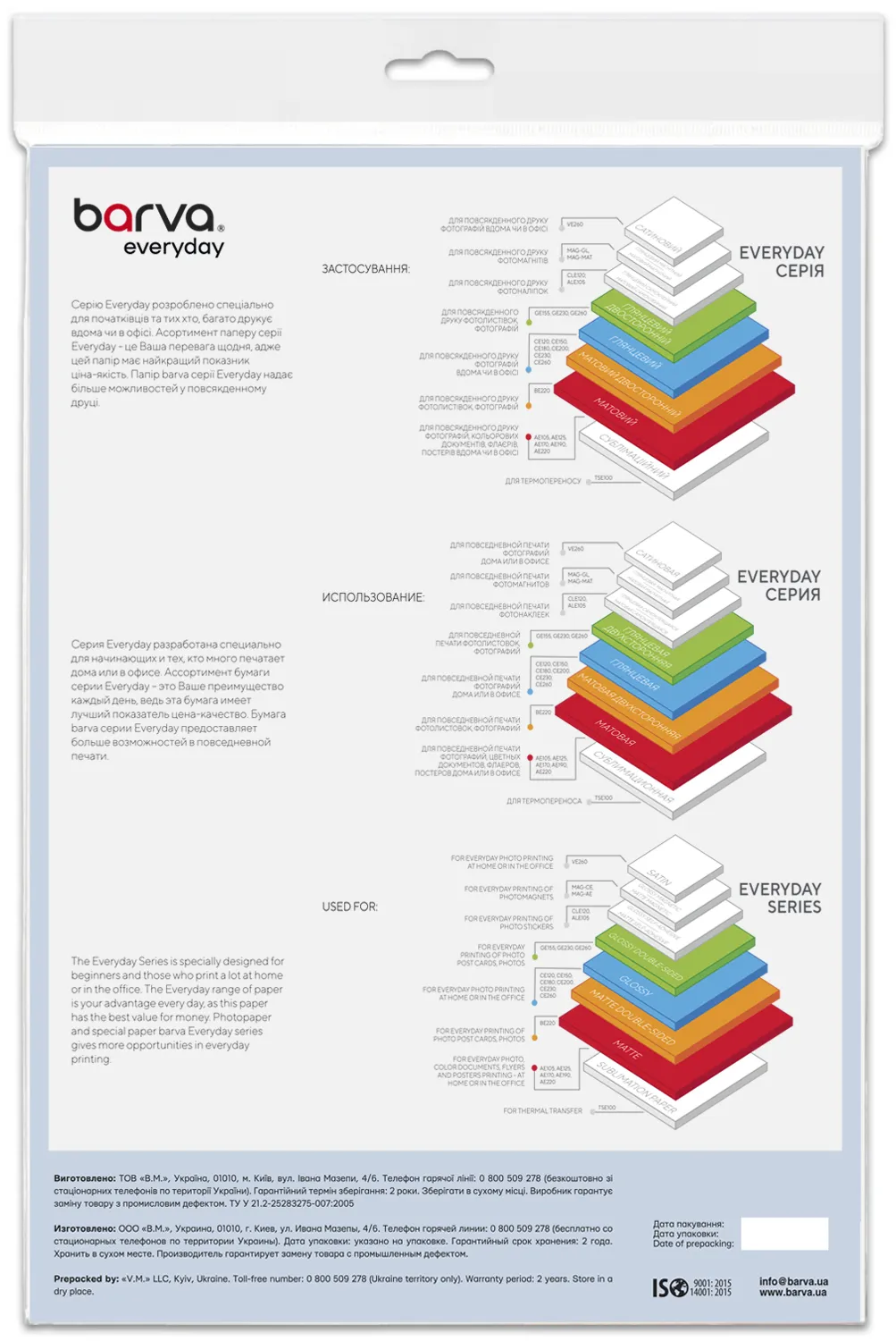 Под торговой маркой Barva на рынок выходит широкий ассортимент материалов для струйной печати, который поможет Вам с выполнением различных задач – от печати фотографий, до изготовления рекламных и маркетинговых материалов. Носители для струйной печати под данной торговой маркой выпускаются на рынок украинской компанией ТОВ «В. М.» с 2003 года и уже успели завоевать доверие пользователей неизменно высоким качеством и доступными ценами.