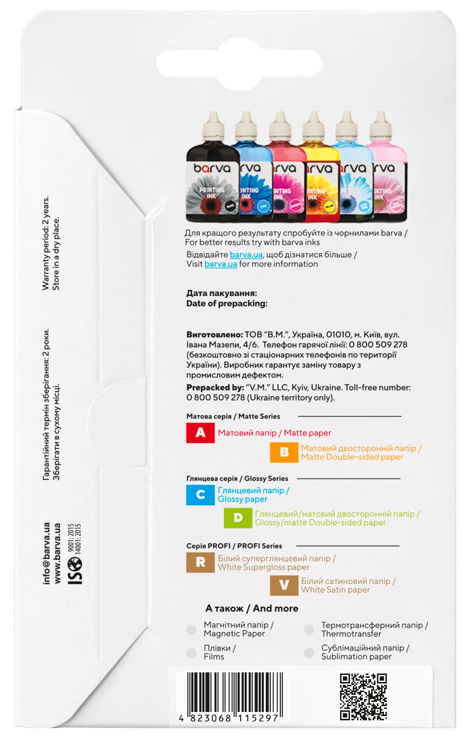 Под торговой маркой Barva на рынок выходит широкий ассортимент материалов для струйной печати, который поможет Вам с выполнением различных задач – от печати фотографий, до изготовления рекламных и маркетинговых материалов. Носители для струйной печати под данной торговой маркой выпускаются на рынок украинской компанией ТОВ «В. М.» с 2003 года и уже успели завоевать доверие пользователей неизменно высоким качеством и доступными ценами.
