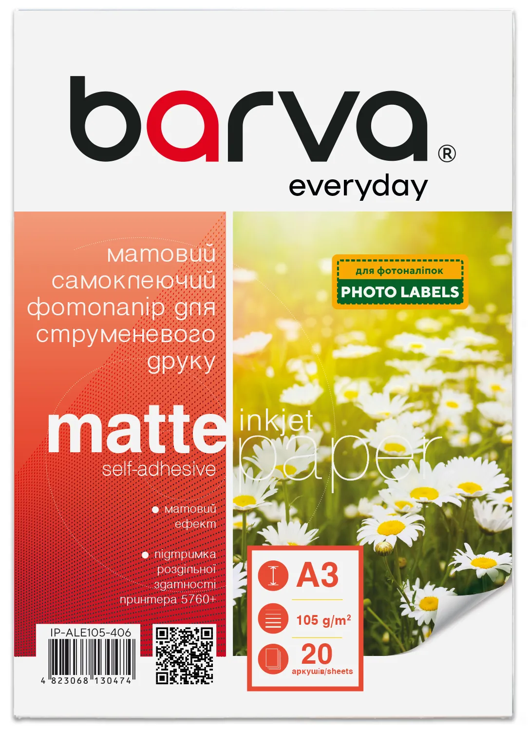 Фотобумага матовая самоклеящаяся 105 г/м2, A3, 20 л Everyday Barva (IP-ALE105-406)