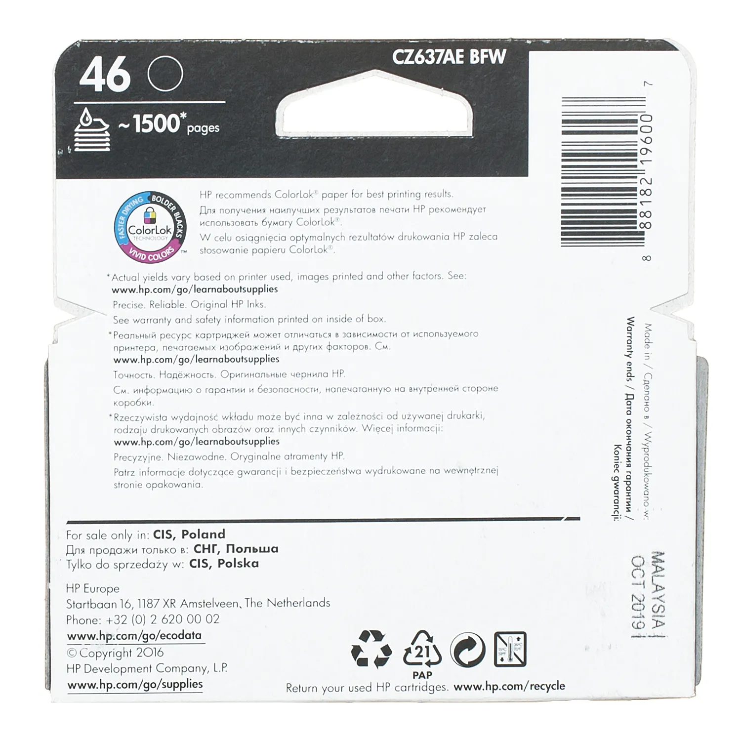 Картридж №46 Ultra Ink Advantage черный HP (CZ637AE) описание:
