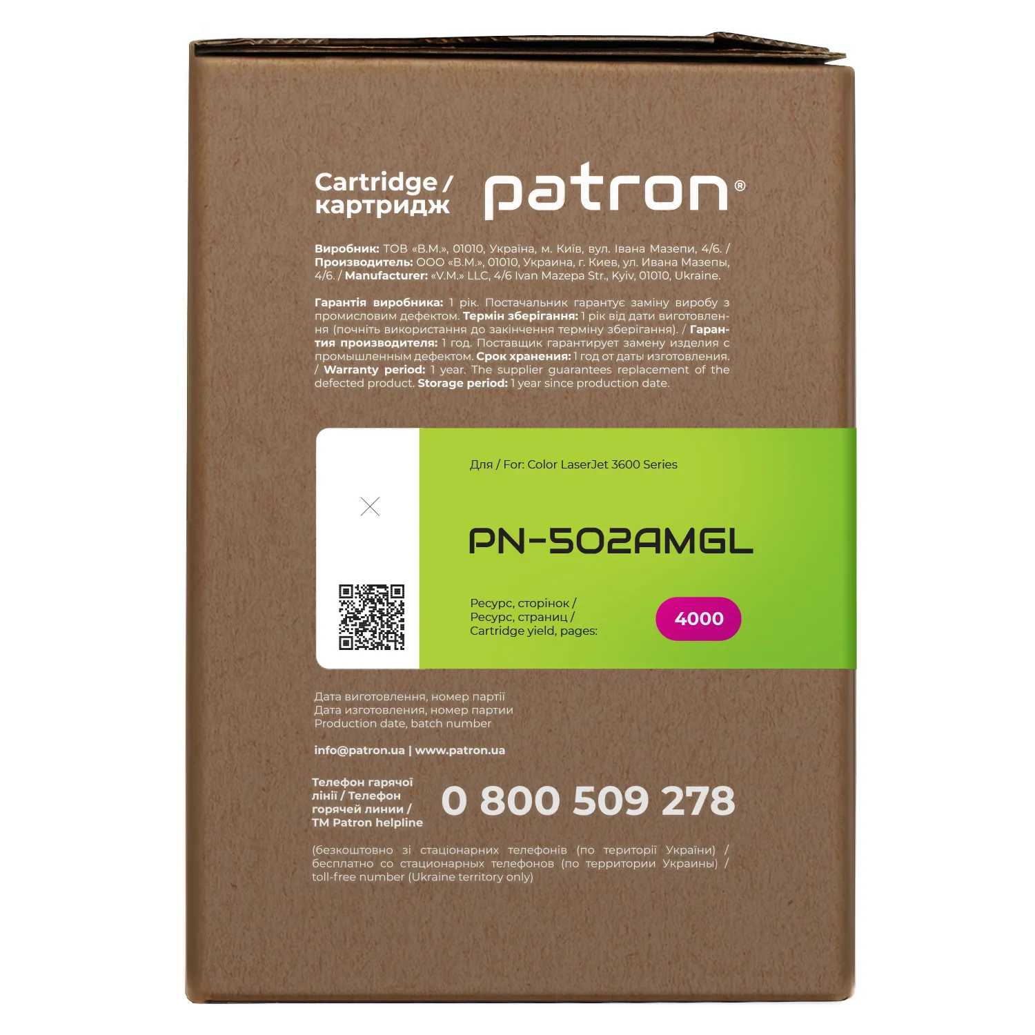 Мы позаботились о том, чтобы упаковка картриджа была не только экологичной, функциональной, имела минимально возможные физические размеры, но и содержала всю необходимую информацию. На зеленой этикетке находится информация о продукте, его совместимости с печатающими устройствами, номер партии, дата изготовления, контакты производителя, а также номер телефона бесплатной горячей линии для украинских потребителей.