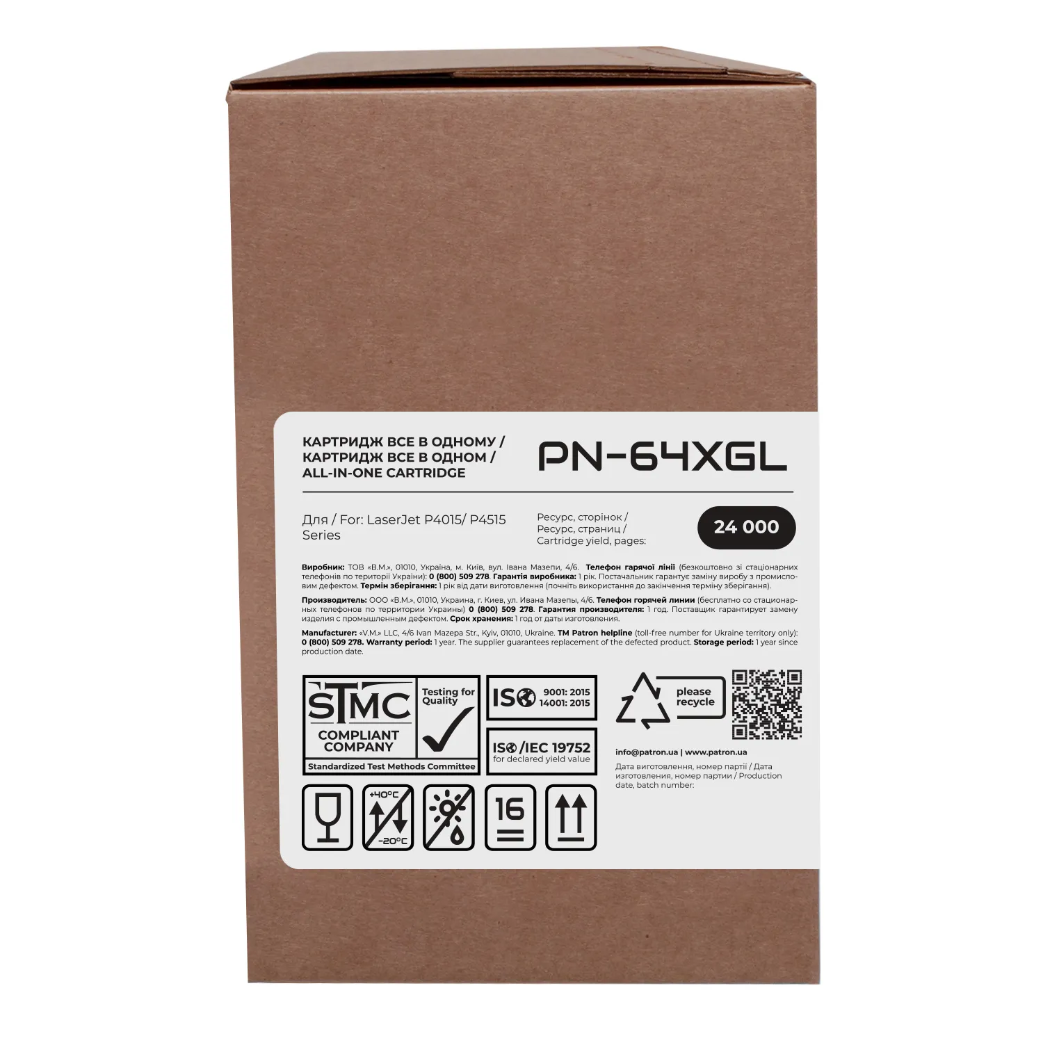 Производство картриджей Patron Green Label происходит с выполнением требований международного стандарта по защите окружающей среды- ISO 14001:2015.