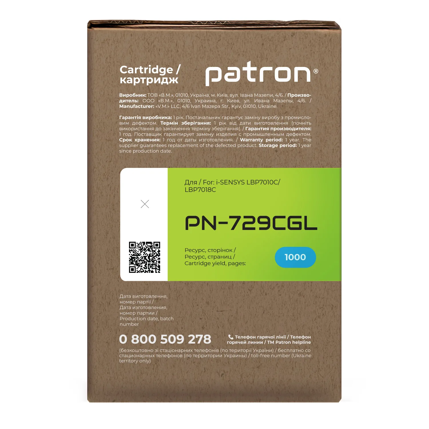 Мы позаботились о том, чтобы упаковка картриджа была не только экологичной, функциональной, имела минимально возможные физические размеры, но и содержала всю необходимую информацию. На зеленой этикетке находится информация о продукте, его совместимости с печатающими устройствами, номер партии, дата изготовления, контакты производителя, а также номер телефона бесплатной горячей линии для украинских потребителей.