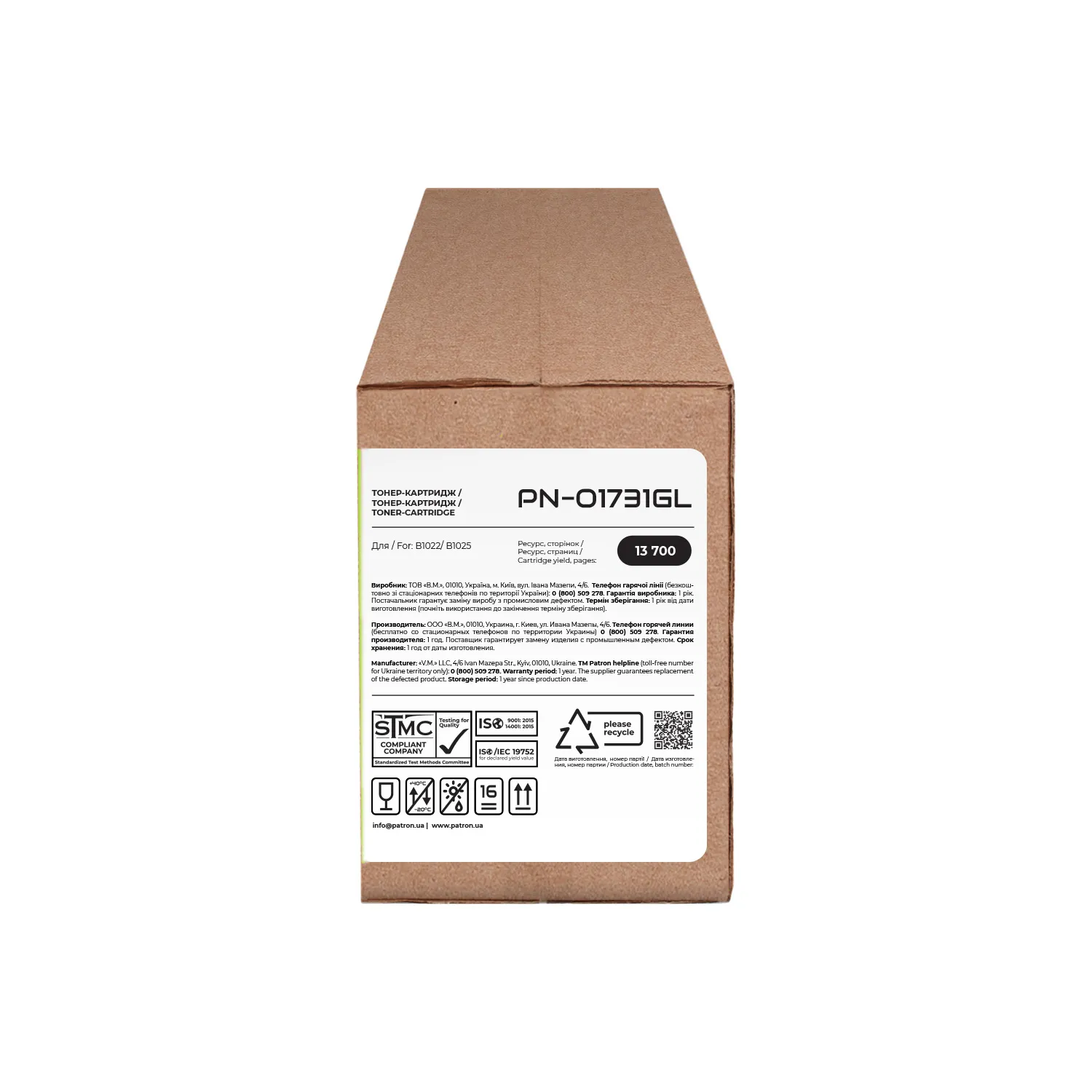 Мы позаботились о том, чтобы упаковка картриджа была не только экологичной, функциональной, имела минимально возможные физические размеры, но и содержала всю необходимую информацию. На зеленой этикетке находится информация о продукте, его совместимости с печатающими устройствами, номер партии, дата изготовления, контакты производителя, а также номер телефона бесплатной горячей линии для украинских потребителей.